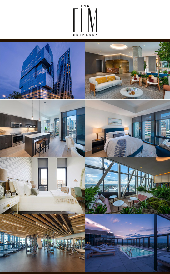 The Elm connects those craving a new approach to modern living with a residential destination that marries sophistication and comfort. Nestled around a blissful green park in the heart of downtown Bethesda, with access to the Bethesda Metro, The Elm features stunning views of Washington, DC and beyond from the lushly landscaped rooftop deck and glass Skybridge, which connects two 28-story luxury apartment towers.