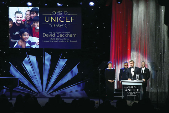 Also honored at the ball was football (soccer) legend David Beckham, who received the Danny Kaye Humanitarian Leadership Award. Celebrating the end of his first decade as a UNICEF Ambassador, Beckham also launched "7: The David Beckham UNICEF Fund," named for his football jersey number and designated to protect and advocate for disadvantaged children around the world.