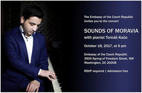 Czech pianist Tomáš Kačo will perform the program Sounds of Moravia, featuring folk songs such as Small Cherries (Čerešničky) and Beskyde, Beskyde, his original composition Hope, and the classic song Over the Rainbow by Harold Arlen at the Czech Embassy on October 18, at 6 pm. As a solo pianist, Kačo’s unique style is an interesting fusion of classical, jazz and gypsy music. His piano recitals are based on improvisation. The main idea of these improvisations is a “renaissance” of gypsy music, often improvising on traditional gypsy themes. Soak in the sounds of Moravia, performed by the gifted pianist Tomáš Kačo.