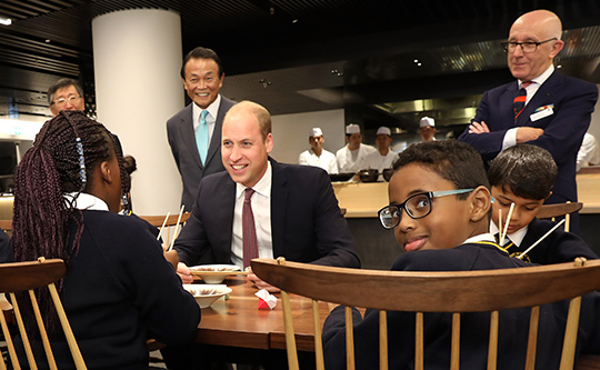 Prince William greets Japan's Deputy Prime Minister Taro Aso and students during the offcial opening of Japan House London, the new Cultural Home of Japan in the U.K. on September 13, 2018 in London, England.