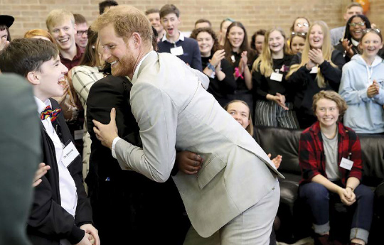 Prince Harry gently hugs a student as he meets with young people on a visit to Joff Youth Centre in Peacehaven in East Sussex, southern England, on October 3, 2018. The Duke and Duchess of Sussex made their frst joint offcial visit to Sussex on October 3 where they met young people from youth groups across East Sussex to hear their strategic plans and priorities around emotional health and wellbeing.