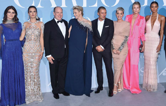 (L-R) Brazilian model Isabeli Fontana, Brazilian model Alessandra Ambrosio, Prince Albert II of Monaco, Princess Charlene of Monaco, British actor Orlando Bloom, American signer Katy Perry, German model Toni Garrn and Brazilian model Lais Ribeiro attend the Monte-Carlo Gala for the Global Ocean 2018 on September 26, 2018 in Monte-Carlo, Monaco.