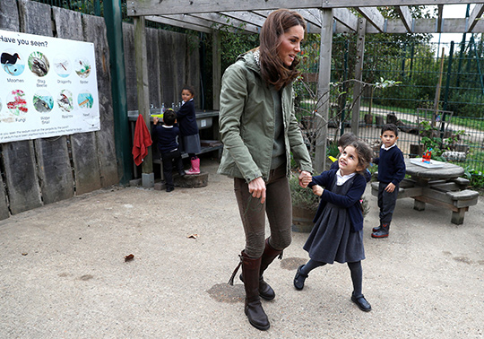 Catherine, Duchess of Cambridge, talks with school children during her visit to Sayers Croft Forest School and Wildlife Garden in London on October 2, 2018. Sayers Croft is a residential activity center based in Surrey, which is owned by Westminster City Council. It aims to involve children and the local community in the environment, providing outdoor facilities for those who may otherwise be unable to access them.