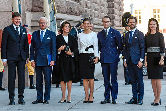 (L-R) Andreas Norlen, new Speaker of the Parliament with Swedish Royals: King Carl Gustaf, Queen Silvia, Crown Princess Victoria, Prince Daniel, Prince Carl Philip, and Princess Sofa as they take a moment to pose for a picture upon arrival to the opening of the Swedish Parliament Riksdagen on September 25, 2018 in Stockholm