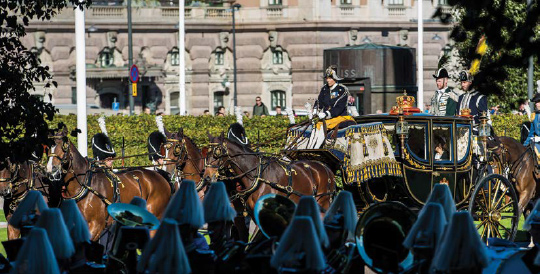 The Swedish royal family arrives by horse and carriage at the opening parliamentary session at the Riksdag parliamentary house on September 25, 2018 in Stockholm, Sweden.