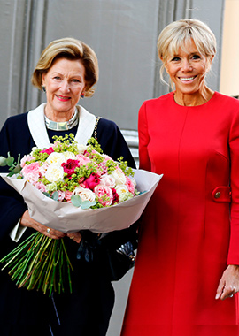 Norway's Queen Sonja poses with French President's wife Brigitte Macron before visiting the Pierre Corneille high school in Rouen, northwestern France, on September 24, 2018.