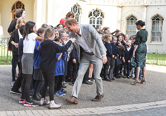 Prince Harry, Duke of Sussex and Meghan, Duchess of Sussex greet local school children in Brighton during an offcial visit to Sussex on October 3, 2018 in Brighton, United Kingdom. The Duke and Duchess married on May 19, 2018 in Windsor and were conferred The Duke & Duchess of Sussex by The Queen.