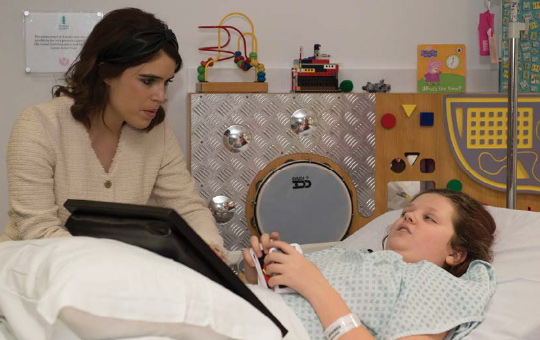 Princess Eugenie of York meets patient Maggie Hawkes, 12, during a visit to the Royal National Orthopaedic Hospital to open the new Stanmore Building.