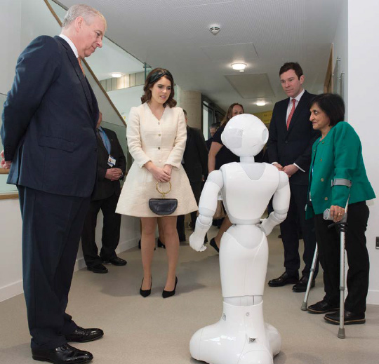 The Duke of York Visits The Royal National Orthopaedic Hospital: (L-R) Prince Andrew, Duke of York; Princess Eugenie of York; Jack Brooksbank; and Dr. Saroj Patel meet a robot called Pepper, during a visit to the Royal National Orthopaedic Hospital to open the new Stanmore Building on March 21, 2019 in Stanmore, Greater London.