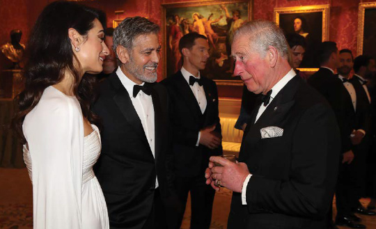 The Prince Of Wales Hosts Dinner To Celebrate 'The Prince's Trust' on March 12, 2019: Amal and George Clooney speak to Prince Charles as they attend a dinner to celebrate ‘The Prince's Trust’ at Buckingham Palace in London, England. The Prince of Wales, President, The Prince’s Trust Group hosted a dinner for donors, supporters and ambassadors of Prince’s Trust International.