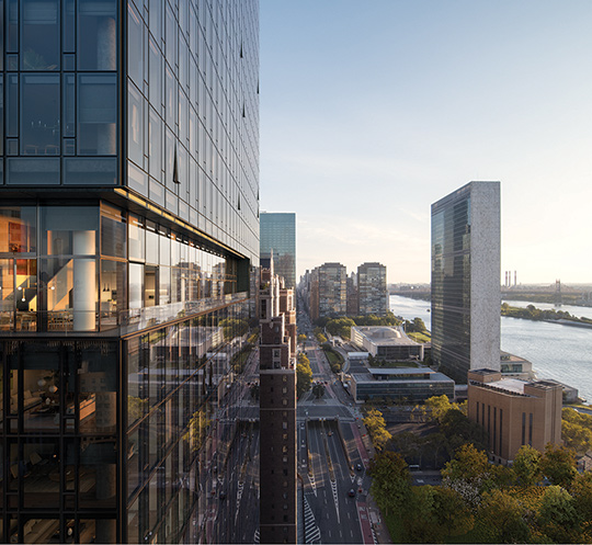 The United Nations complex on First Avenue at the foot of East 44th Street has a new and striking neighbor to the south at 695 First Avenue between East 39th and East 40th Streets. Midtown Manhattan has a burgeoning new neighborhood, One United Nations Park, nestled between the UN’s Turtle Bay site and Murray Hill. They are one and the same.