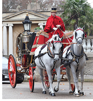 The formalities of diplomatic audiences with the monarch have changed little since Victorian times. Royal protocol extended to the new ambassadors included being collected from their residence or embassy in a State landau, a ceremonial horse-drawn carriage, and driven through the streets of London preceded by a second ceremonial carriage in which rode HM Marshall of the Diplomatic Corps, Alistair Harrison. Upon arrival at Buckingham Palace, ambassadors were met by the Queen’s Equerry, Major Tom White, and escorted into the palace.