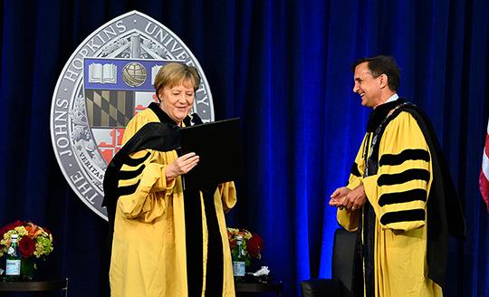 These same themes were reiterated as Chancellor Merkel received the Doctor of Humane Letters honorary degree from Johns Hopkins University and its School of Advanced International Studies in Washington, D.C. University President Ronald Daniels lauded Merkel for helping to keep democracy alive during her tenure as “a vocal defender of human rights even in the midst of growing nationalism and isolation. Chancellor Angela Merkel,” he continued, “has not only led Germany but been a beacon for the world during crises from the Great Recession to the Covid-19 pandemic. Bringing a scientist’s rigor to policy and a deep humanity to politics, she has defended the values of open discourse, freedom of inquiry, and human flourishing that lie at the heart of democratic society and its institutions.”