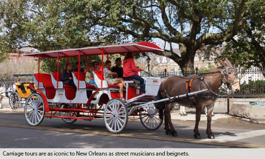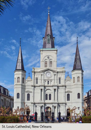 Most visitors to New Orleans head straight for the French Quarter for its cultural potpourri of history, food, architecture, and entertainment. Walking among historic buildings with lacy filigree cast-iron-trimmed balconies that now house restaurants, nightclubs, bars, boutiques and galleries, each with its own legend or ghost story, seems to be the best way to absorb the local vibes. Everywhere you go, the sounds of blues, ragtime, and jazz—the only home-grown type of American music—spill from the doorways or from street musicians. Outdoor vendors sell hot dogs, hot tamales and frozen yogurt alongside flowers and tourist trinkets. Artists, psychics, clowns, magicians, and human statues showcase their talents against the backdrop of St. Louis Cathedral and the Pontalba buildings that line opposite sides of Jackson Park. Converted into shops, restaurants and museums, the buildings were named after Madame de Pontalba, the dynamic Creole aristocrat who designed them in the 19th century. These buildings were the inspiration for the lacy balconies found throughout the French Quarter that now serve as launch pads for the beads and baubles thrown to pedestrians along Bourbon Street during the days leading up to Mardi Gras.